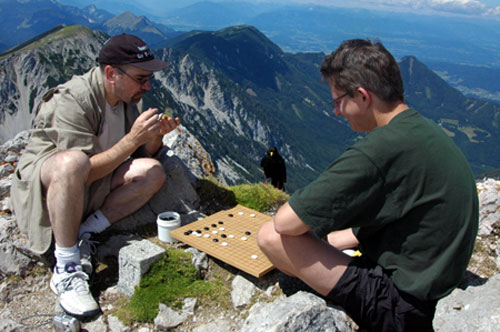 (top right) Atop Hochstuhl (Veliki Stol) mountain on the Austria- Slovenia border, 2,236 meters up, Chris Garlock (l) plays tengen against Andreas Hauenstein while an Alpendohle (Pyrrhocorax graculus) kibitzes. Photo by Steffi Hebsacker