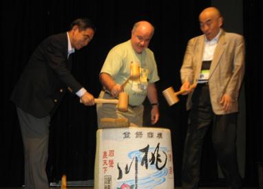 legendary Takemiya Masaki 9P helping break open a cask of sake and an