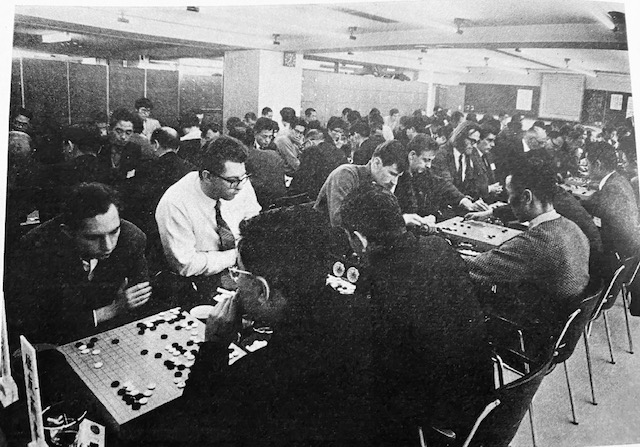 On February 11, the Nihon Ki’in Team Tournament began. At the urging of Fujisawa Hōsai 9d, a “gaijin” team entered the event for 15 player teams. 11 Americans, 2 Austrians and 2 British made up the “Ishi Press Team.” Their first three boards were Manfred Wimmer, Richard Bozulich and James Davies – you can make them out in the attached picture from the event. Other notables were one time AGA President Robert McCallister and Congress Director Stuart Horowitz. Unfortunately full names are not given and we are left to speculate whether “Hall” was T. Mark Hall, co-creator of GoGOD. The top boards had a solid 70% win rate, but the tail end of the team was not as successful, and they were eliminated in the initial stage.